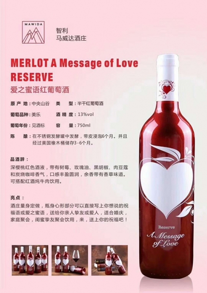 ◇酒评:爱之密语红葡萄酒,深樱桃红色酒液,带有树梅,玫瑰油,黑胡椒,肉豆蔻