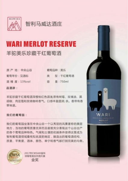 • 商标/品牌:智利原瓶进口羊驼美乐珍藏干红葡萄酒