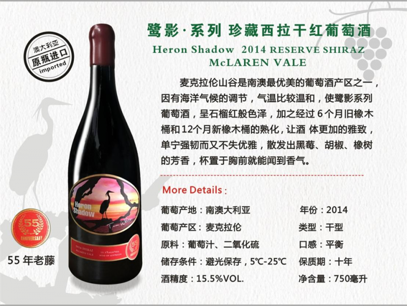 名称:鹭影系列 珍藏西拉干红葡萄酒