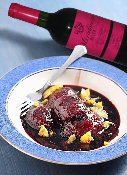 (本次选择的红酒是西班牙雷拉斯玫瑰米拉布诶诺餐酒,主要是因为它便宜,而且颜色较深,剩下的半瓶可以在烹饪过程中慢慢品尝,这酒入口比较醇和,丹宁味不重。糖选择砂糖也可,不过冰糖更清甜。)